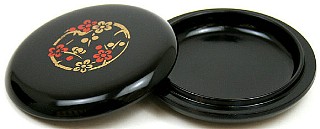 Item description : Chabako set with 3 items such as a tea caddy, a Kogo and a Chasen-zutsu (a tea whisk holder) made of plastic with the same Makie works of Hanamaru (flowers in circle)
