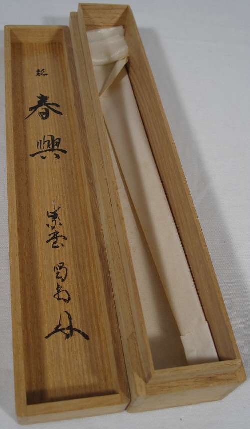 Item description : Tea scoop with a Mei ""Shunkyo" (an enjoyment of Spring" drawn by a chief priest Mr Katsudo Hosoai at Ryugenin temple in Kyoto