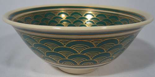 Item description : Kyoyaki tea bowl in Hira-chawan style with modern design of Seikaiha (blue ocean wave)