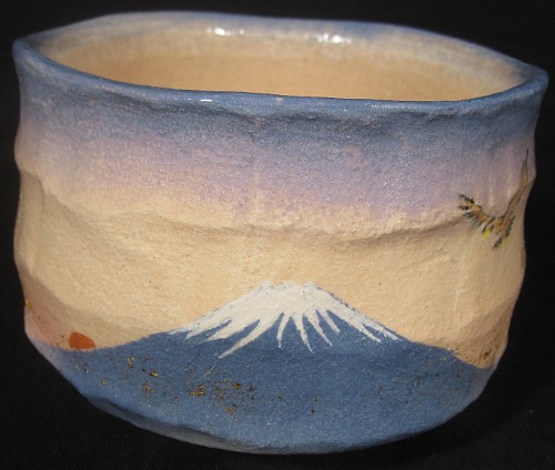 Item description : Raku-yaki tea bowl with design of Mt Fuji, Hawk and Nasu(eggplant) which are auspicious things to see in our first dream of the year