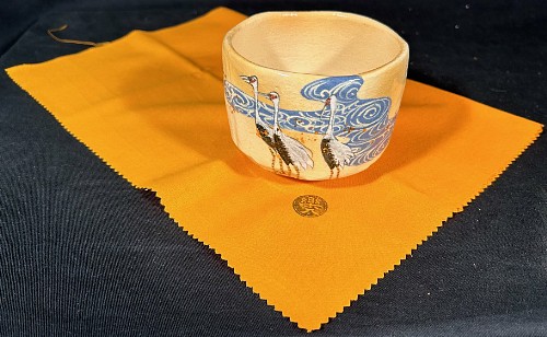 Item description : Raku-yaki tea bowl with attractive design of "Gunkaku-zu" (group of cranes) originally drawn by Korin Ogata who is a great artist in Edo period (1600's)