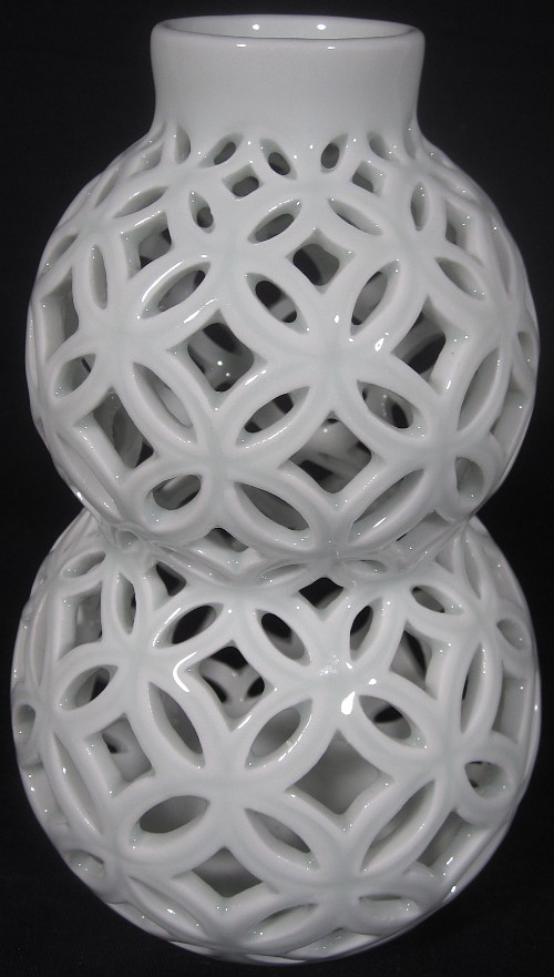 Item description : Mikawachi yaki Hakuji (white porcelain) made Shakutate (a water ladle holder) with Sukashi (openwork) in gourd