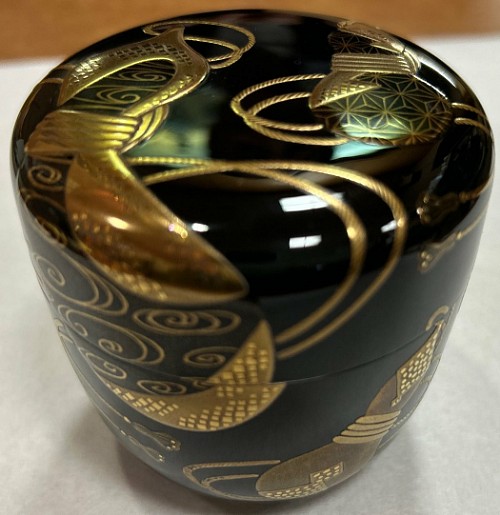 Item description : Oh Nastume tea caddy with fantastic Makie works of 6 gourds (Mubyo/sick-free in Japansese which means being healthy for ever) made of gold leaf