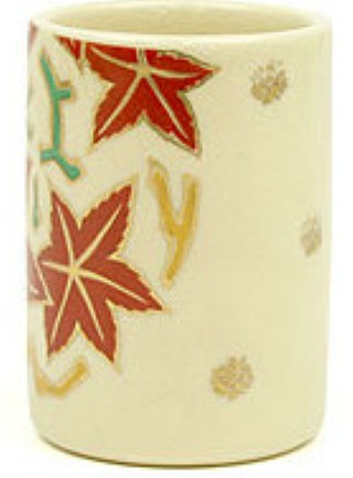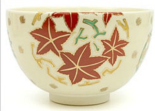 Item description : This is a Kyoyaki set of tea bowl, Furidashi (a sweet container) and Chakin-tate(a holder) with elegant design of mample leaves. Please get these pieces and make your own assortment of Rikyubako set with them.